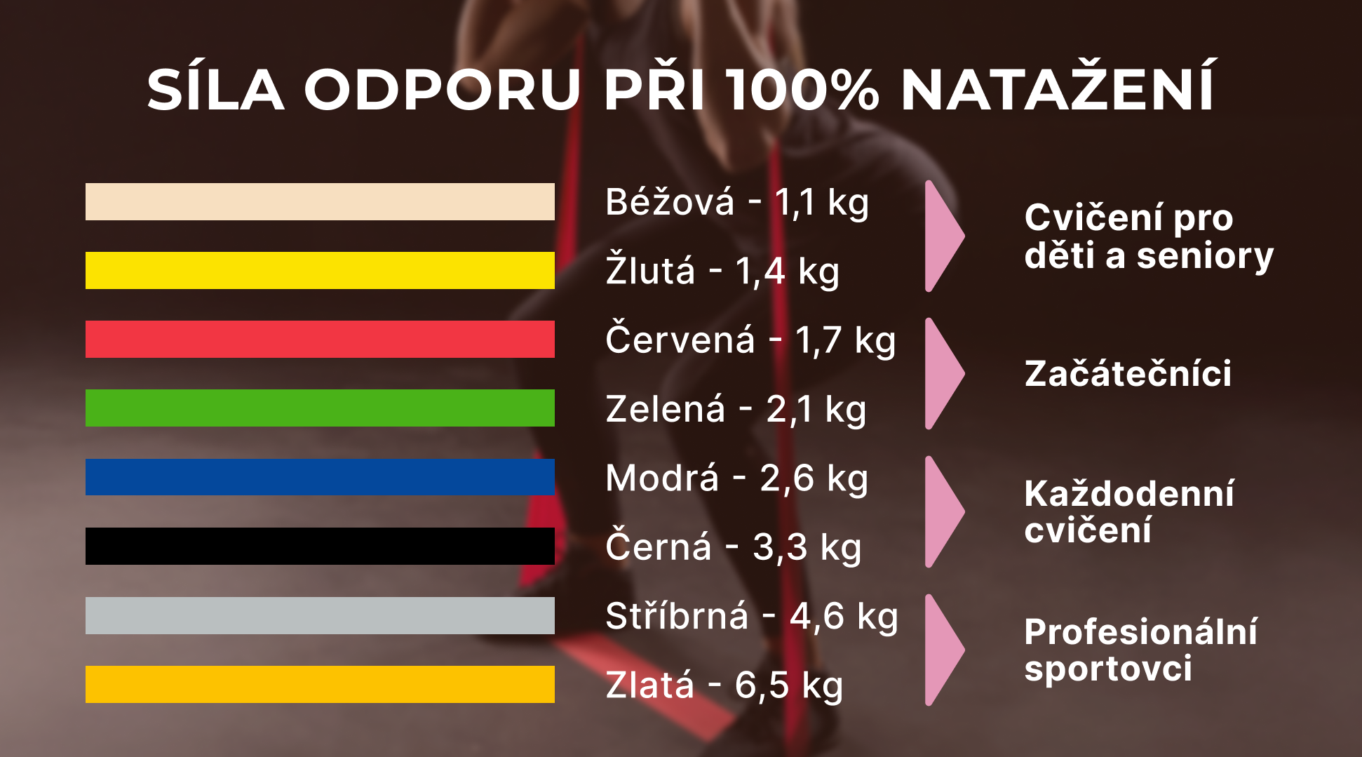 Síla odporu posilovací gumy Thera-Band Inside (100% natažení)